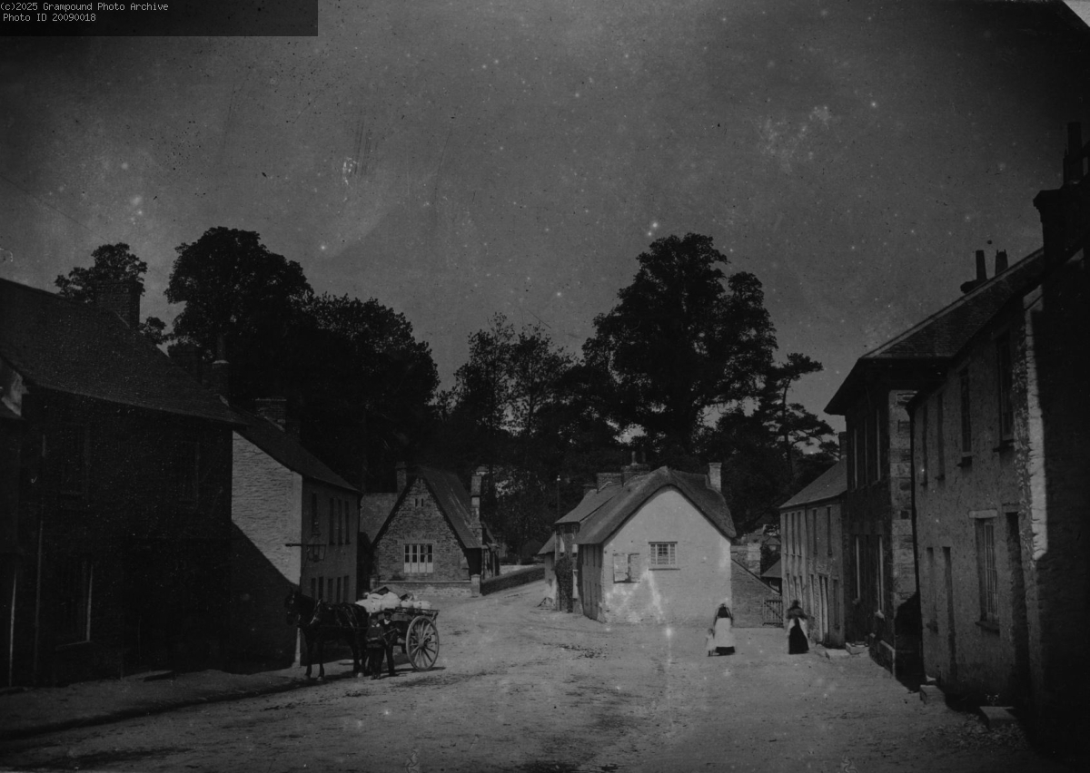 Fore Street with cart and people showing old bridge and school