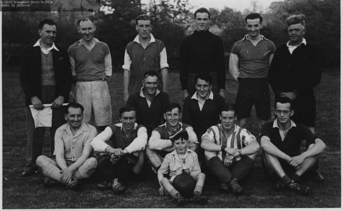 Grampound football team - 1948. Back row (from left) Ernie Cundie, Donald Olver, Charlie Rowe, Norman Mannell, Basil Spry, Sid Phillips referee. Middle row are (from left) Harold Cox and Kenneth Borden. Front row are (from left) William Pascoe, Harold Tregunna, Elvin Blake, Hedley Bennett, unknown. The mascot with the ball (front) is Ian Mannell.