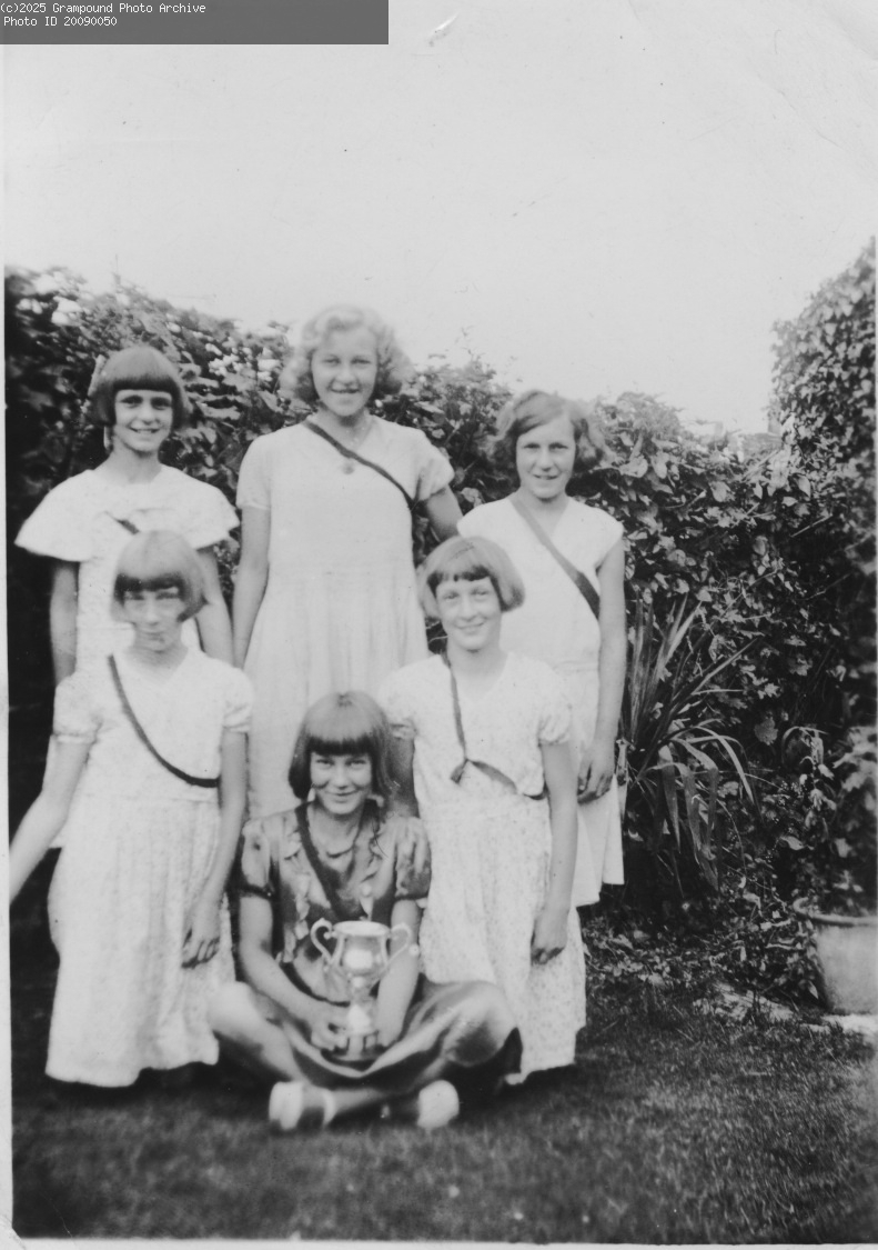 Winning Relay Team 1933. Standing at the back (from the left) are Audrey Mannell, Lilly Wyatt, Betty Pascoe. Kneeling in the centre are (from left) Kathleen Goodman, Helene Goodman. Seated at the front with the trophy is Barbara Allen (now Tregunna).