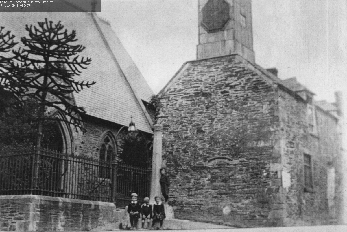 Grampound Town Hall pre-1894 when the clock was replaced as a result of a donation by the Rev Charles Henry Vivian. A plaque noting this gift is now attached to this elevation. Note the oil lamp outside the Church. The last man to fill this was Charles Knowles who is thought to have lived at Myrtle Cottage on Old Hill.