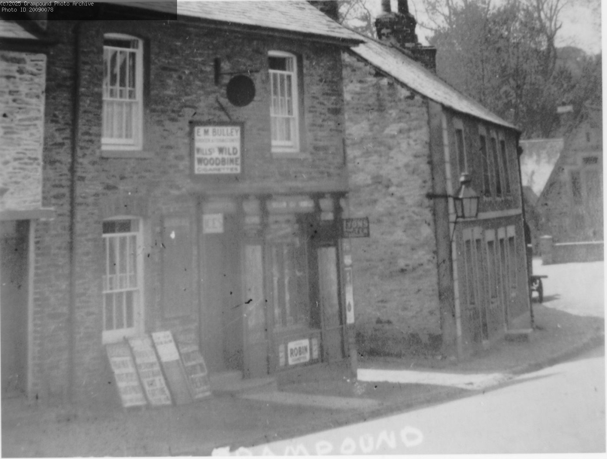 Shop of E M Bulley in Fore Street, in 1934. Mrs Bulley ran the shop; she was later re-married - to Fred Strongman. A girl called Mary Hoskins worked in the shop; she later married George Juleff, one of the six children of Eva Juleff (nee Mannell) who lived at Trengoffe on Old Hill between the wars. (see also 20090079)