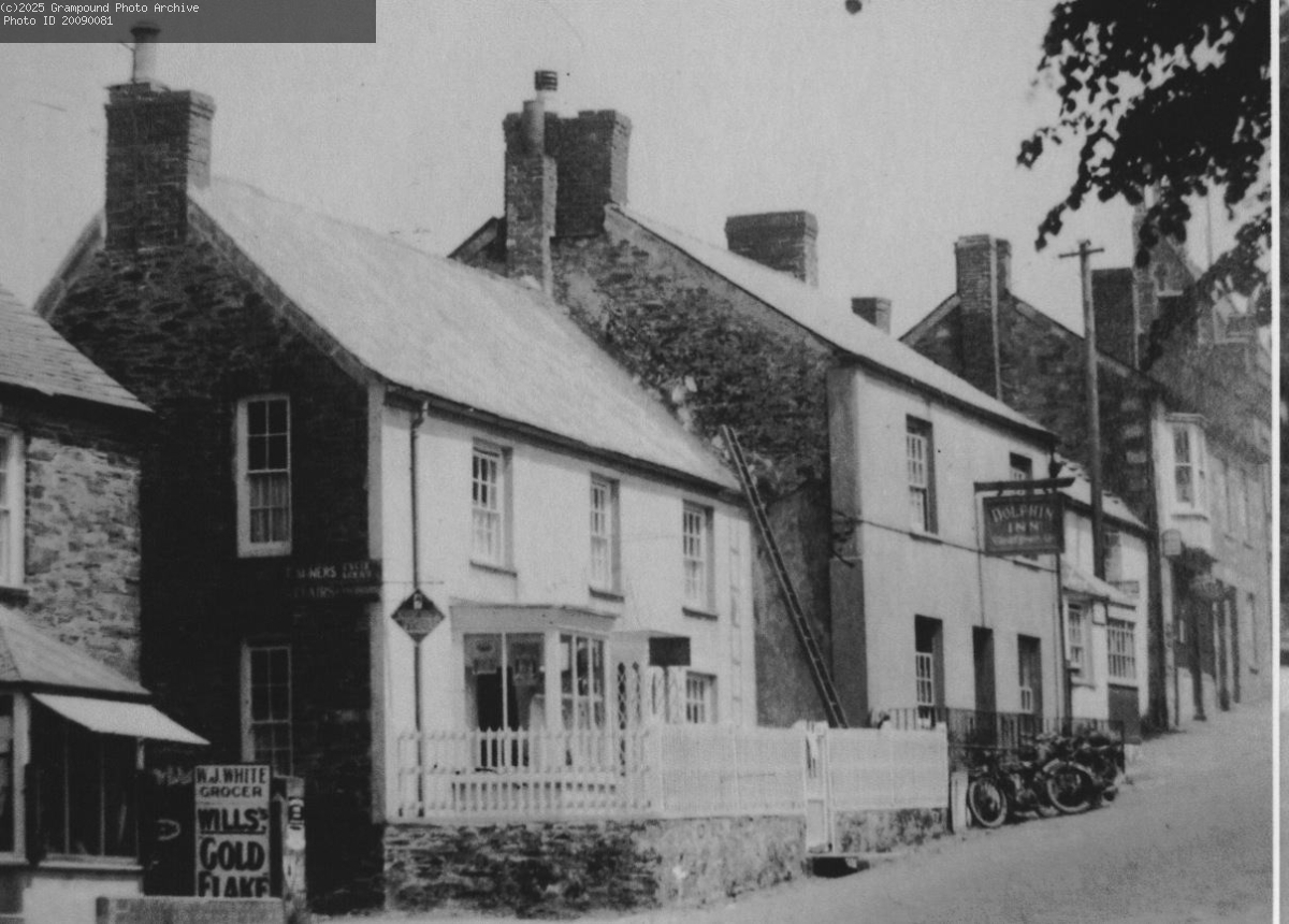 Fore Street showing the Dolphin Inn; the shop uphill from the Dolphin was also a General Store run by Mrs Osborne. Her son, John Osborne, had a coal round and his yard was located on the site now occupied by the closed petrol station near to the bridge. This photograph was probably taken during World War 2.