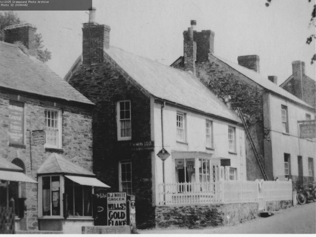 Fore Street showing W J White's General Store and Miners' Cycle Shop with the Dolphin in the background. This photograph was probably taken during World War 2. W J White's closed in the 1960s and Miners'in the 1970s.