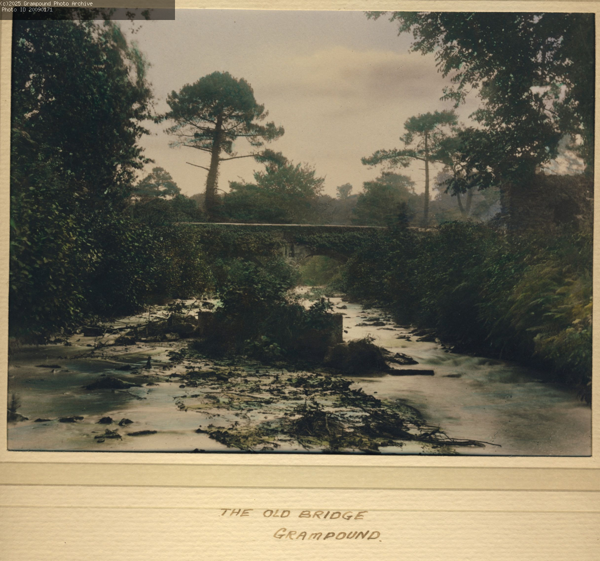 A painting of the old bridge at Grampound. It is to be assumed that the ruins in the centre foreground are those of the old bridge that was replaced in 1834. The structure in the background is probably the bridge that stood from 1834 until the late 1960s when the present (2008) bridge was built. The 1762 -1834 bridge stood slightly downstream of its two successors. The main road to Truro was then 'Old Hill', rising steeply out of the valley and passing the Roman fort of Carvossa. The school stands on the line of the old road on the Creed side of the River Fal and the line of cottages set back from the main road close to the entrance to the Village Hall shows its route as it approached the bridge. There are three date stones set into the masonry of the present bridge on the upstream side - 1762, 1834 and 1969. The original framed painting bears the inscription 'presented by H E Julyan'.