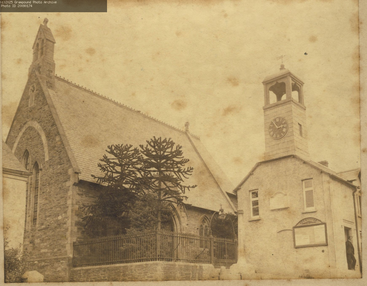 The Town Hall and St Nun's Church showing the new clock and plaque but not the War Memorial; this places this photograph between 1894 and 1918.
