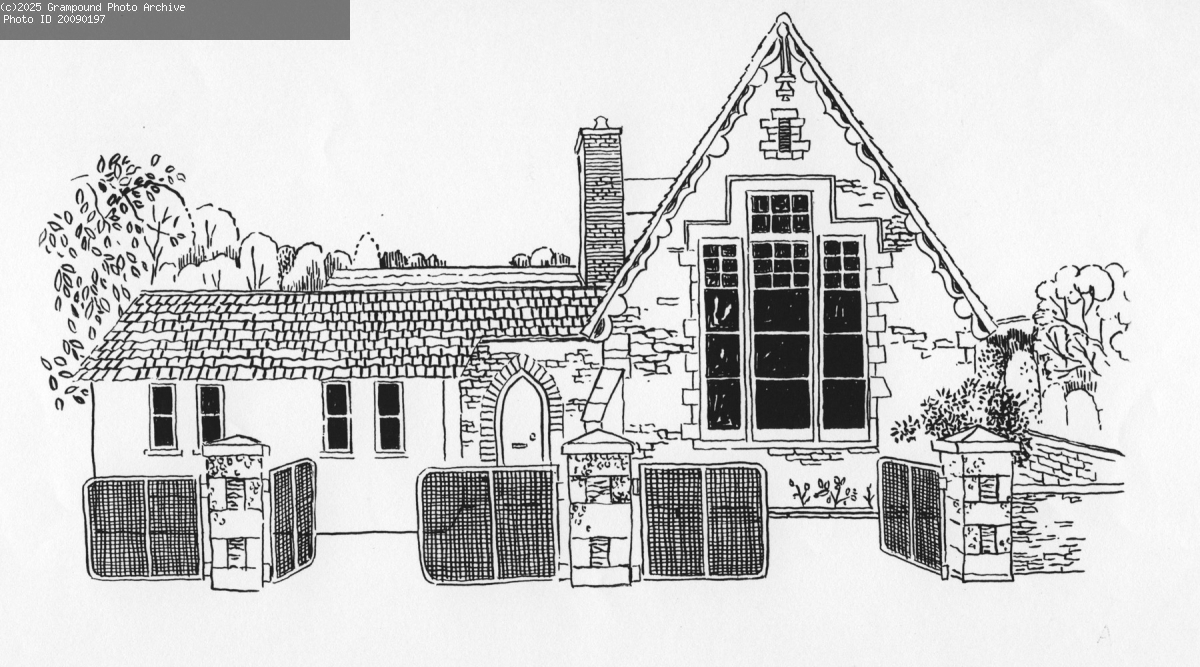 An original drawing for the Booklet 'Grampound with Creed' published in 1992 by Amy Bane and Mary Oliver. Grampound with Creed Junior and Infants School built in 1869. The present large window under the gabled section was probably installed c1900 to replace a smaller one. The school stands on the line of the road leading to the earlier bridge over the River Fal that was replaced in 1834; 'Old Hill' was then the main road to Truro.