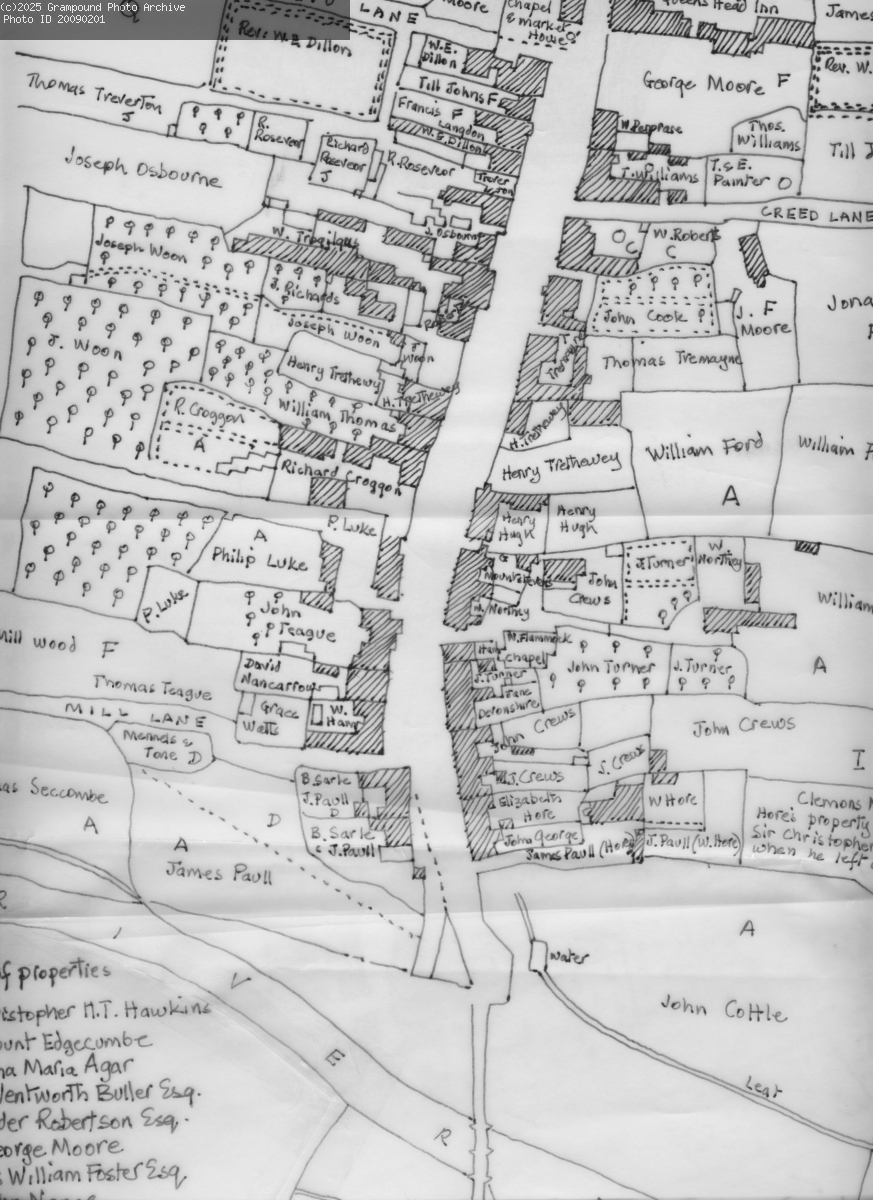Tracing of a map of Grampound made by Mary Oliver. The original map was drawn by H St Aubyn in 1831 and it shows the ownership/lessees of property at that time. This shows Lower Fore Street on Creed side.