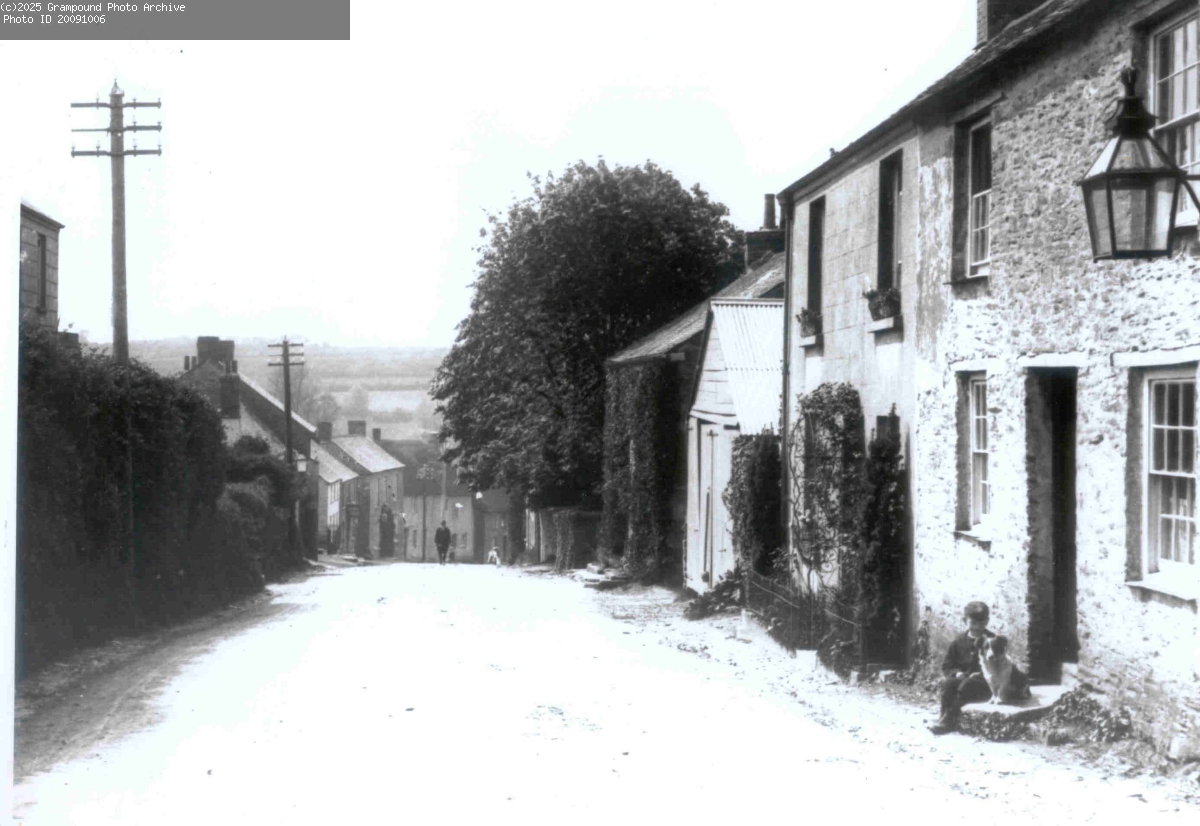 Eastern end of Fore Street looking west down the hill. Unnamed boy with dog on the right.