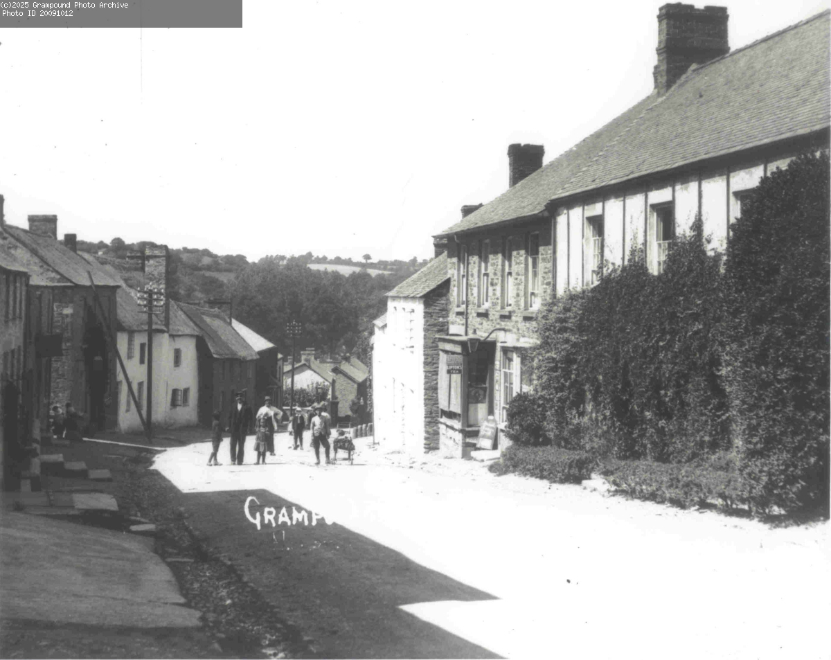 Top of Fore Street looking west. The Post Office, in 2009 Hollies Store and Post Office, can be seen on the right. Note the lower level of the road than now on the left. Pedestrians seem untroubled by the possibility of road traffic! The Manor House and Croggon's Tannery office can be seen on the left a little down the hill.
