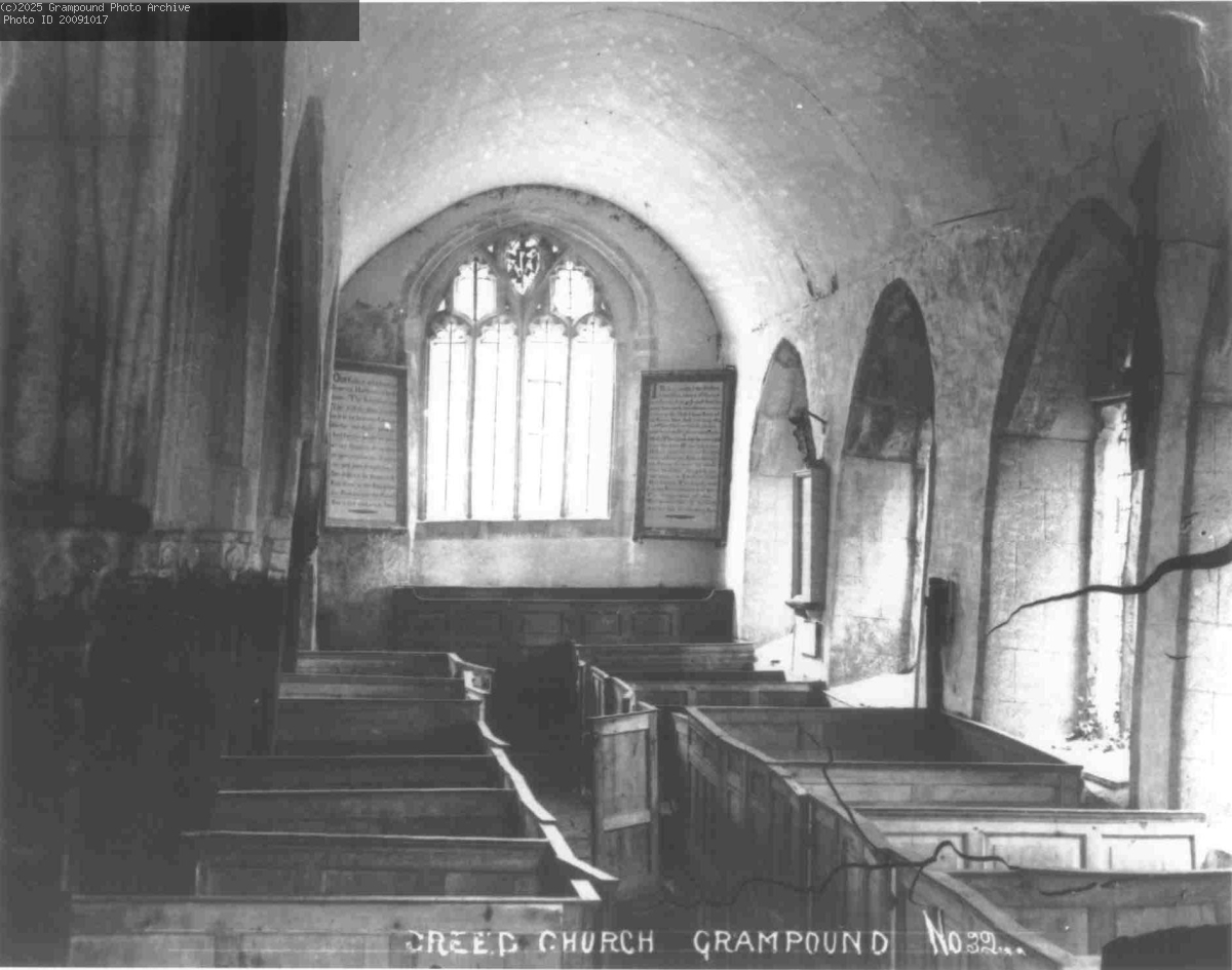 The interior of Creed Church before restoration in 1904. This photo shows clearly the old box pews that were removed during the restoration.