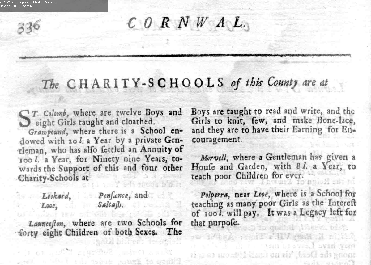 Some details of Grampound Charity School. It is not clear if this refers to the Church School, built in the 1860s, or another institution. The source of the information is not known.