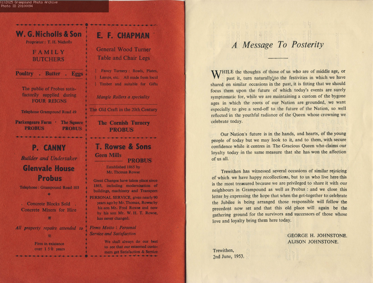 Inside front cover/page 1 - Coronation Day Programme 1953. This is a scanned copy of the programme of events in Grampound and Probus associated with the coronation of Queen Elizabeth II in 1953.