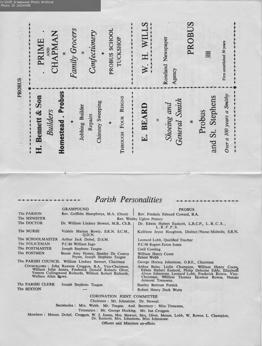 Pages 2/3 - Coronation Day Programme 1953. This is a scanned copy of the programme of events in Grampound and Probus associated with the coronation of Queen Elizabeth II in 1953.