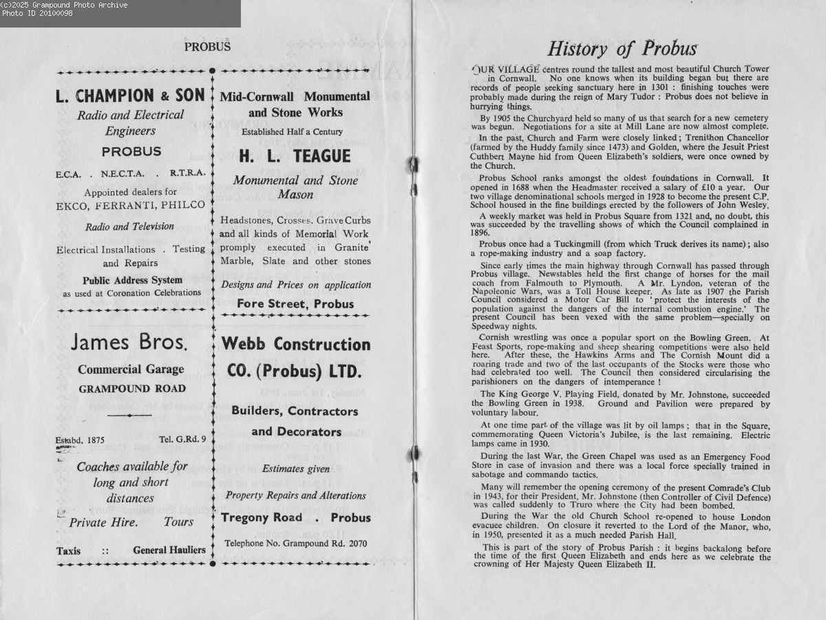 Pages 8/9 - Coronation Day Programme 1953. This is a scanned copy of the programme of events in Grampound and Probus associated with the coronation of Queen Elizabeth II in 1953.
