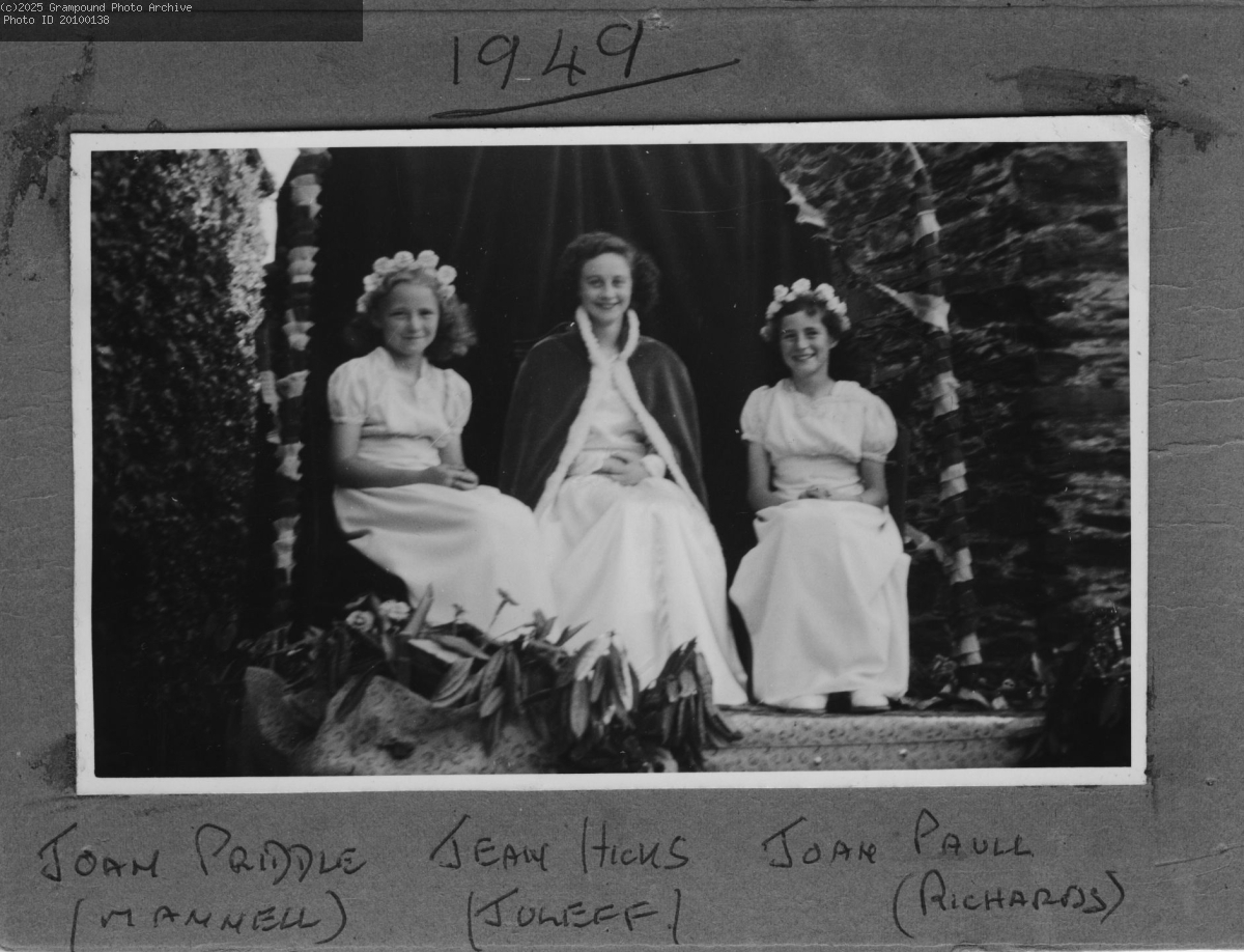 Carnival Queen 1949 showing (left) Joan Priddle nee Mannell, (centre) Jean Hicks nee Juleff and (right) Joan Paull nee Richards.