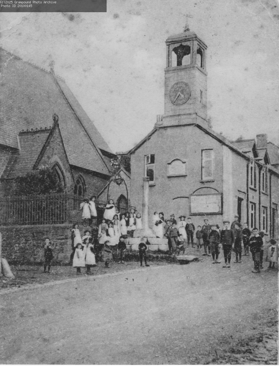 Grampound Town Hall; group of children around the market cross perhaps on the day of a Sunday School excursion.
