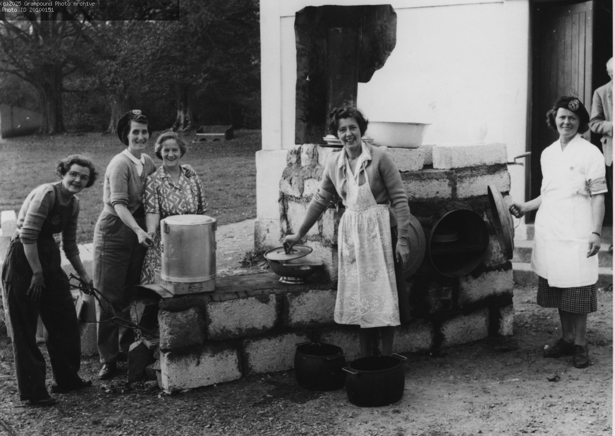 The WRVS pictured doing some outdoor cooking - c 1955. This is probably in the recreation ground outside the old Village Hall. From the left the figures are Mrs Cundy (daughter-in-law of Mr Cundy, the blacksmith of Old Hill) Mrs Broom of 'Vendor' on Old Hill, Mrs Juleff (daughter-in-law of Eva Juleff of 'Trengoffe' on Old Hill), Mrs James of Bartliver and Mrs Hawkesworth who occupied 'Trengoffe' on Old Hill after Eva Juleff.