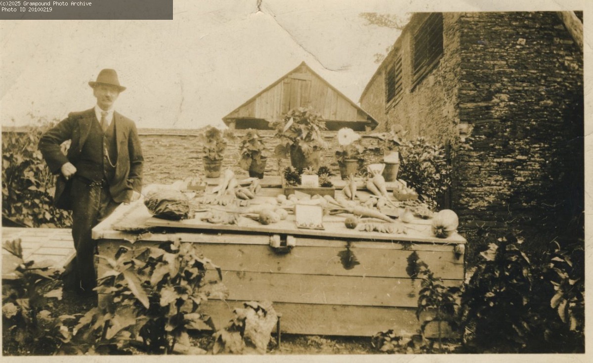 Jack Allen exhibiting his vegetables at one of the garden shows held in the village in the earlier years of the 20th century. This may have been held on land belonging to Croggon's tannery. John Thomas Allen was born c1872 and was a life-long resident of Grampound. He worked at Croggon’s tannery and was the father of 2 sons and 3 daughters.
