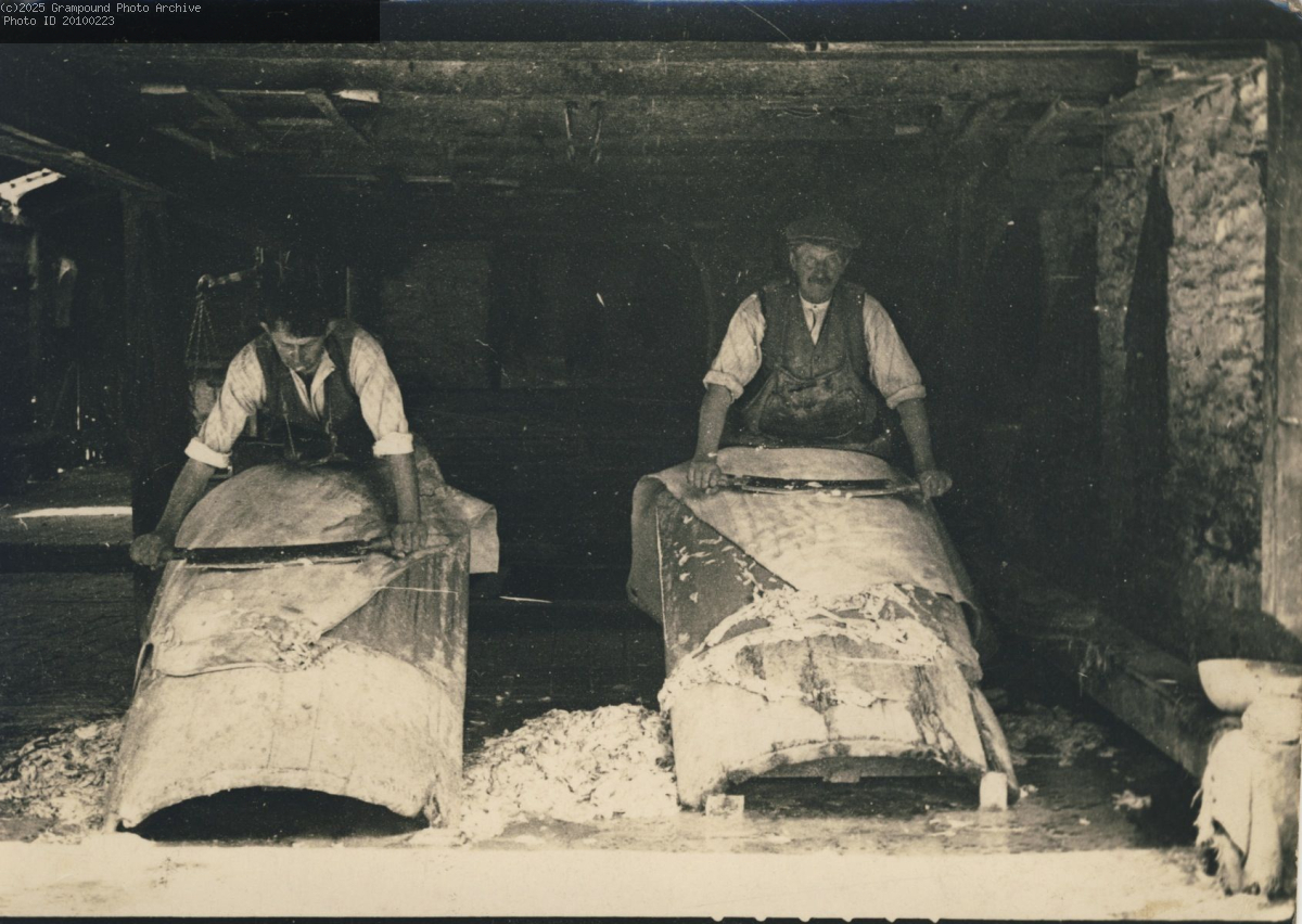 Father Jack (John) and son Cyril Allen at the Manor Tannery working hides on the 'beams'.