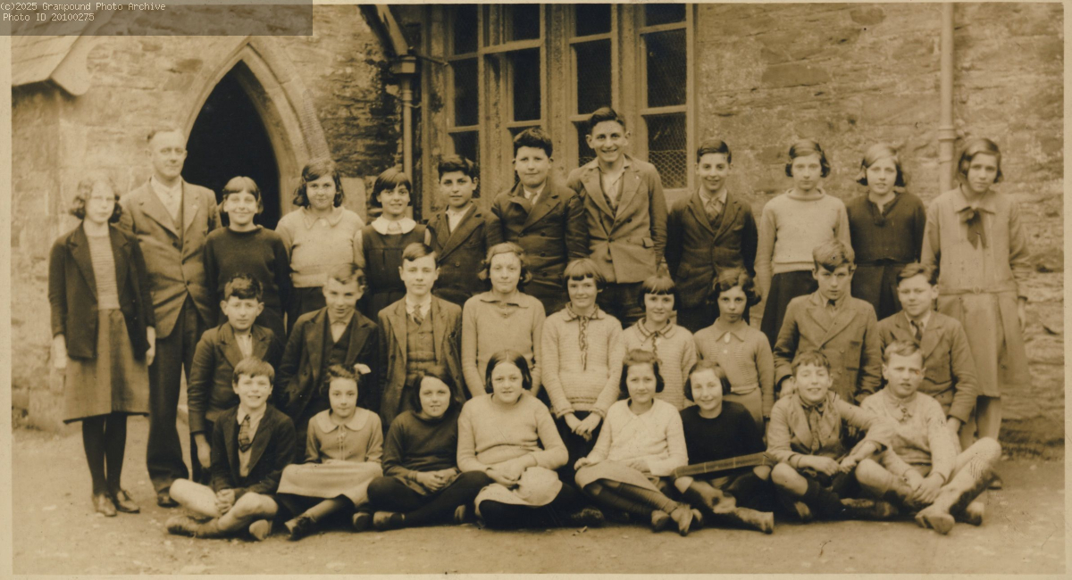 Grampound School 1935. Back - Dora Dawe, RJ Landry, Thalma Farrow, Lilian Cundy, Audrey Mannell, Unknown, Eric Johns, Henry Bulley, Basil Spry, Kathleen Goodman, Unknown, Unknown. Middle - Unknown, Frances Rowe, George Edwards, Heleen Goodman, Doreen Johns, Jean Johns, Unknown, Charlie Rowe, Lennard Goyne. Front - Norman Mannell, Unknown, Cora Brown, Molly Ellis, Bertha Bragg, Ida Rowe, Unknown, Maurice Rowe.