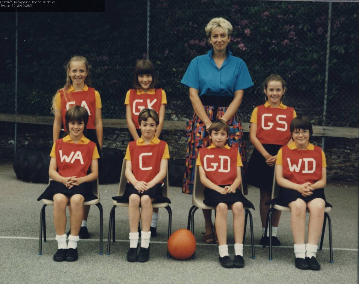 Grampound School 1988 - Netball Team. Back - Caroline Champion, Richenda Tisdale, Mrs Dot Chaffin, (teacher), Sarah-Jane Sherratt. Front - Dee Skellet, Ragen Mallet, Kelly Mallet, Caroline Davis.