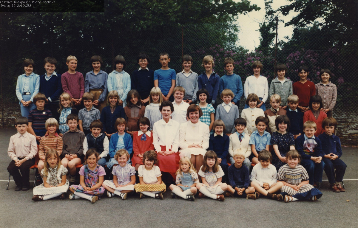 Grampound School 1982. Back l ro r - Nicola Petherbridge, David Warne, Gregory Phillips, Karen Gilbert, Helen Richards, Ben Lundie, Graham Gilbert, Andrew Chinn, Renfrid Hill, Michael Richards, Catherine Tregunna, Glyn Ford, Darren Heather, Shaun Ford. Second - Michael Williams, Christine Pipe, James Petherbridge, Patricia Champion, Donna Still, Jane Cleverley, David Coates, Emma Lundie, Paul Watters, Joanne Chinn, Martyn Wonnacott, John Cleverley, Tracey Champion. Third - Tristan Spalding, Stamford Galsworthy, James Hardaker, Neil Heather, Sharon Tullette, Amanda Wilson, Mrs James, Mrs Coates, Daniel Simpson, Paul Mannell, Neil Kendall, Nicola Thomas, Paul Warne, Paul Tullette. Front - Catherine Champion, Rachel Hearle, Karen Blake, Michael Bray, Ragan Mallett, Katherine Hardacre, Mark Cock, Neal Gilbert, Jenny Oates.
