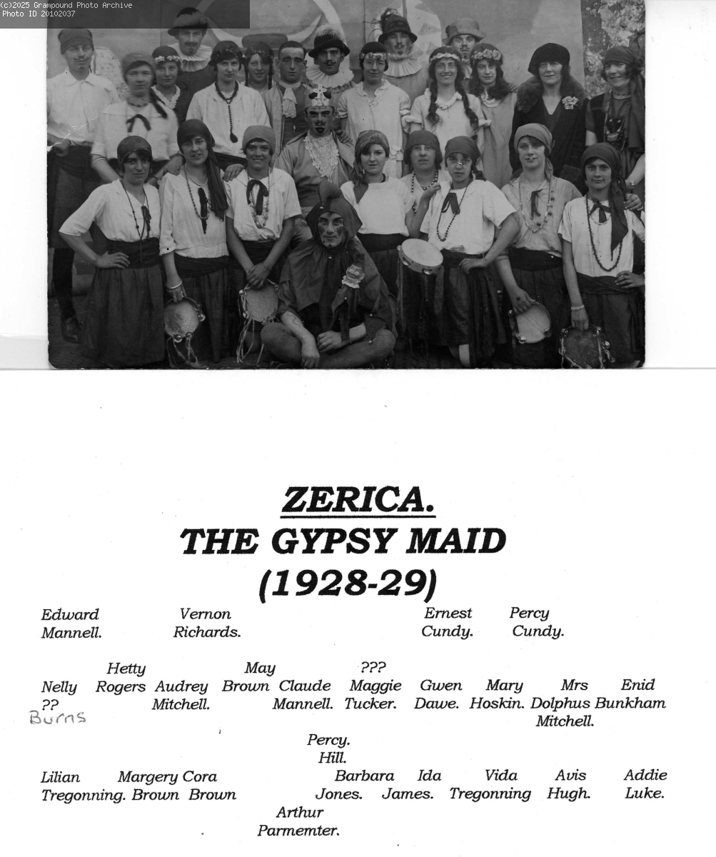 The Grampound Opera Zerica, The Gypsy Maid 1928-29 This photograph is identical to 20091046. The people included are: Edward Mannell, Vernon Richards, Ernest Cundy, Percy Cundy, Nelly Burns, Hetty Rogers, Audrey Mitchell, May Brown, Claude Mannell, Maggie Tucker, Gwen Dawe, Mary Hoskin, Mrs Dolphus Mitchell, Enid Bunkham, Percy Hill, Lilian Tregonning, Margery Brown, Cora Brown, Barbara Jones, Ida James, Vida Tregonning, Avis Hugh, Addie Luke, Arthur Parmeter,