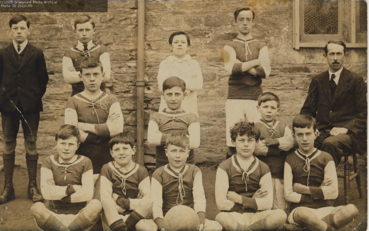 Grampound School football team, probably 1920s. On the right is the Headmaster "Boss" Harding. The tall boy in the back row on the right is thought to be a member of the Mannell family.