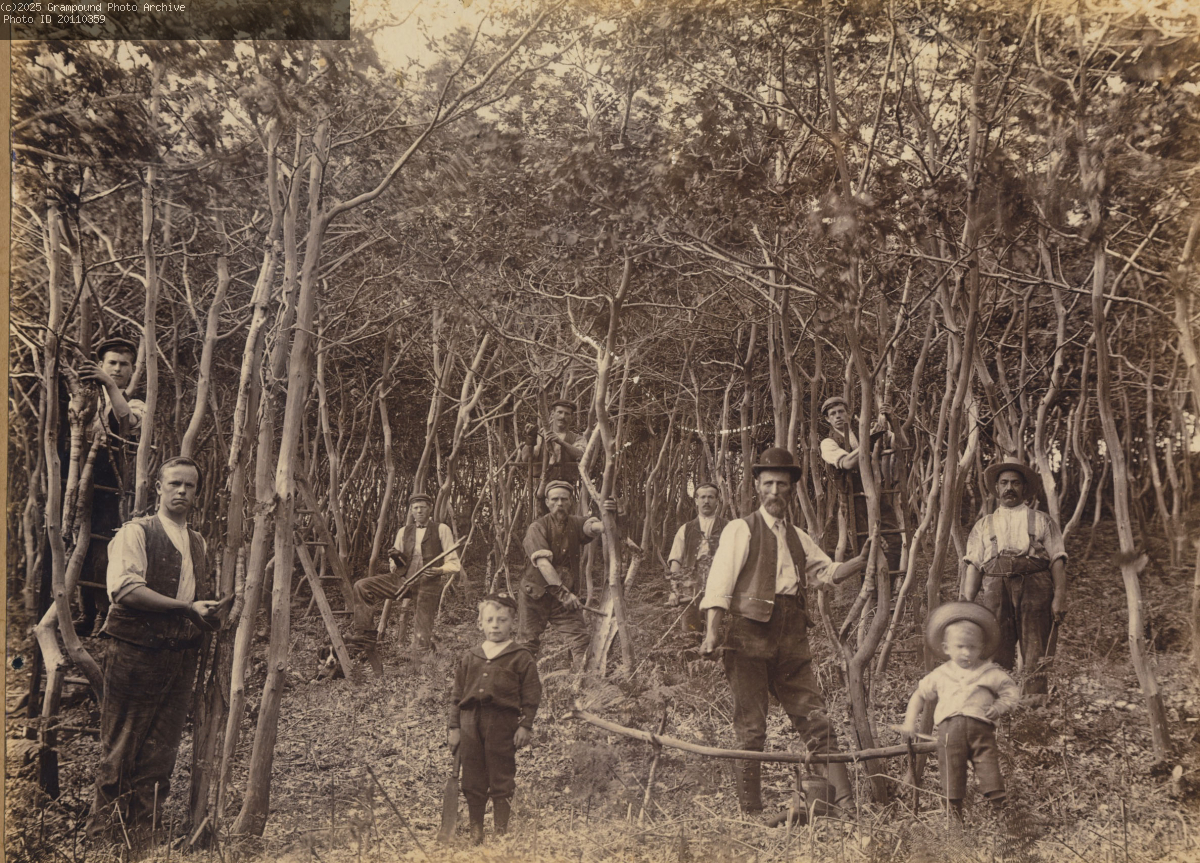 This photo was donated by Geoff Jones, who is a member of the Knowles family of Grampound. It is probably late 19th or early 20th century and the location is thought to be Bosillion Lane. It shows coppiced oak being harvested prior to having its bark stripped to make tanning liquor for the Manor Tannery. This was called rinding bark.