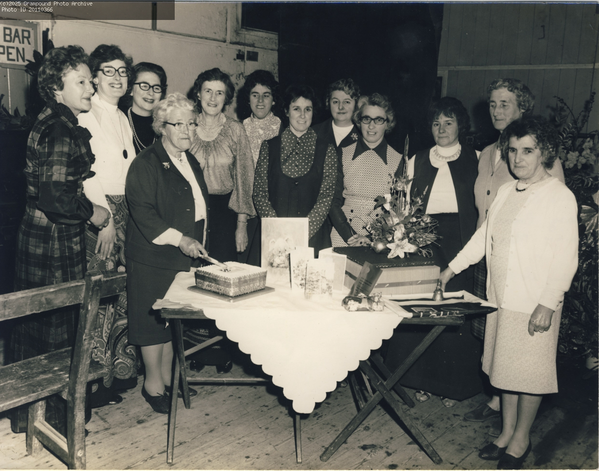 Grampound Women's Institute 50th Anniversary 1974. Committee Members l to r are Trixie Crocker, June Teague, Liz Sherman, Joy Bennett, Pat Paynter, Nancy Newman, Enid Heather, Stella Juleff, Valerie Blayney, Mary Broom, Lilian Mannell. Cutting the cake is Mrs Ellis. Photograph by Robert Roskrow of Highertown Truro.