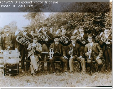 Grampound Town Band in the late 19th century. The Band Leader is seated in the middle of the front row, wearing a watch chain. He is Charles Mannell, the great-grandfather of Chris Libby who donated these images.