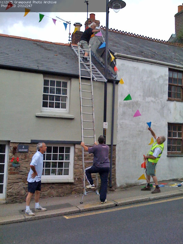 On roof Tony Davies, holding ladder Simon Fann, holding bunting Phil Mannell, supervising(!) Bob Egerton
