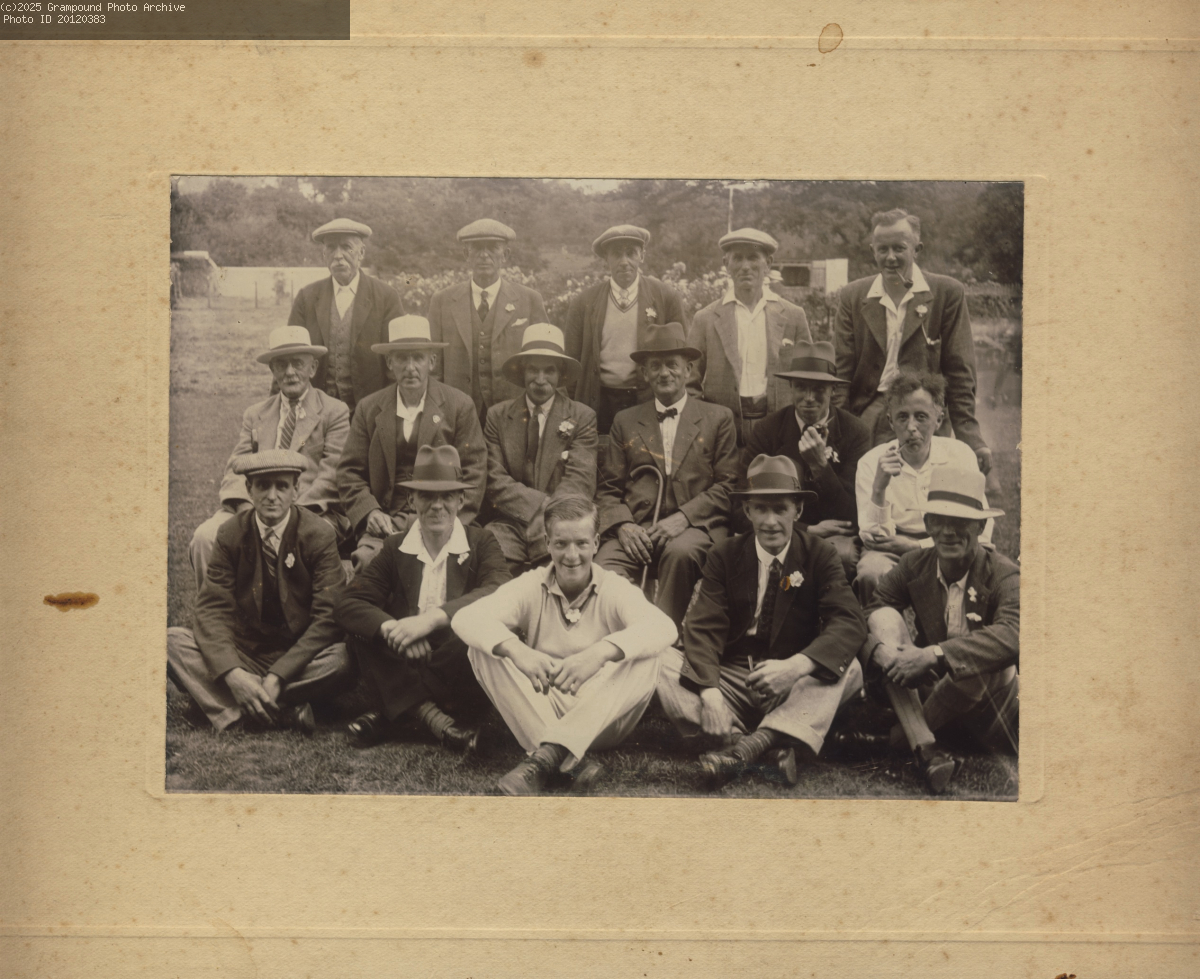 Date unsure but possibly inter-war or just post WW2 bowling club group.The names include - ? Landry, Tommy Daniel, Ian Croggon, Wally Rowe, Jack Bickle, Dick Ellis, (Thunder) Jack Scholar, Fred Mannell, Alfred Mannell.