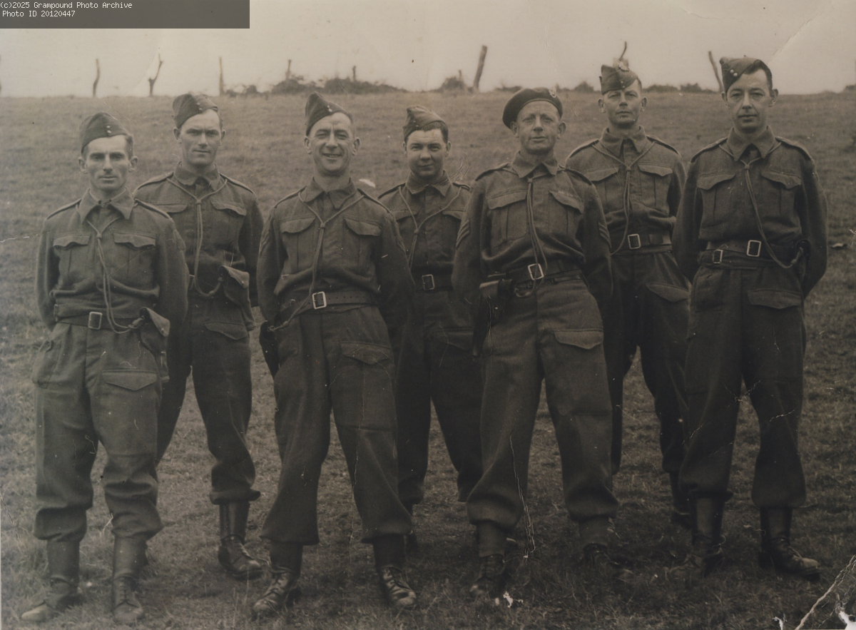 Grampound Auxiliary Unit WW2. As with the Home Guard, the Auxiliary Units were civilians not regular soldiers but they were trained to a higher level of technical capability and it was envisaged that in the event of an invasion, they would harass and obstruct the enemy advance significantly. They were given professional training in the tactics of guerrilla warfare. They remained very secret during and well beyond the end of the war. The Grampound Auxiliary Unit had the task, in the event of an invasion, of blowing up Grampound Bridge in order to obstruct the movement of enemy troops, transport and heavy armour. They had an operational base at the north end of Trewithen Woods, now known as Barteliver Wood. Featured in this photograph are (l to r) WJ (Jack) Richards of Fore Street, HG (Harold) Cock of Moors View, Cpl SA (Sidney) Honey of Fore Street, WJM (John) Osbourne of Ringmore House, Sgt WJ (William) Knowles of Old Hill, CA (Clem) Knowles of Old Hill, IEE (Ire) Broom of Old Hill. Note that they are all carrying revolvers. More information about the Auxiliary Units can be found at Coleshill Auxiliary Research Team - http://www.coleshillhouse.com/ -.