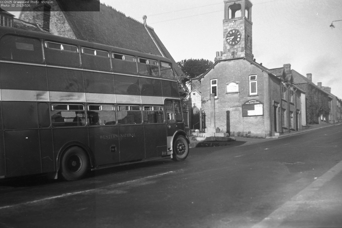 A Western National double decker bus in Grampound close to the junction between Fore Street and Pepo Lane. It is thought that this was just post-WW2. The War Memorial Plaque is missing from the Town Hall.