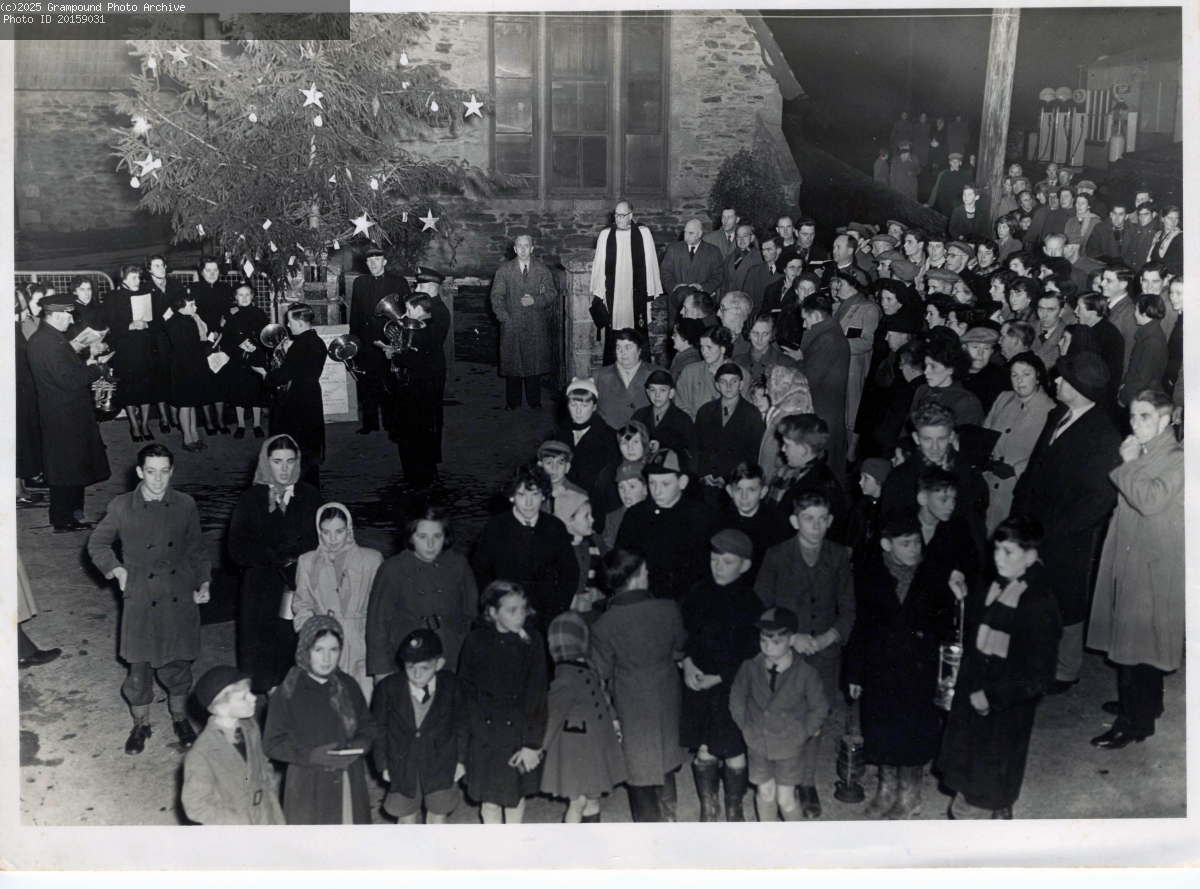 Christmas Carols outside the school. Note the petrol pumps in the top right hand corner.