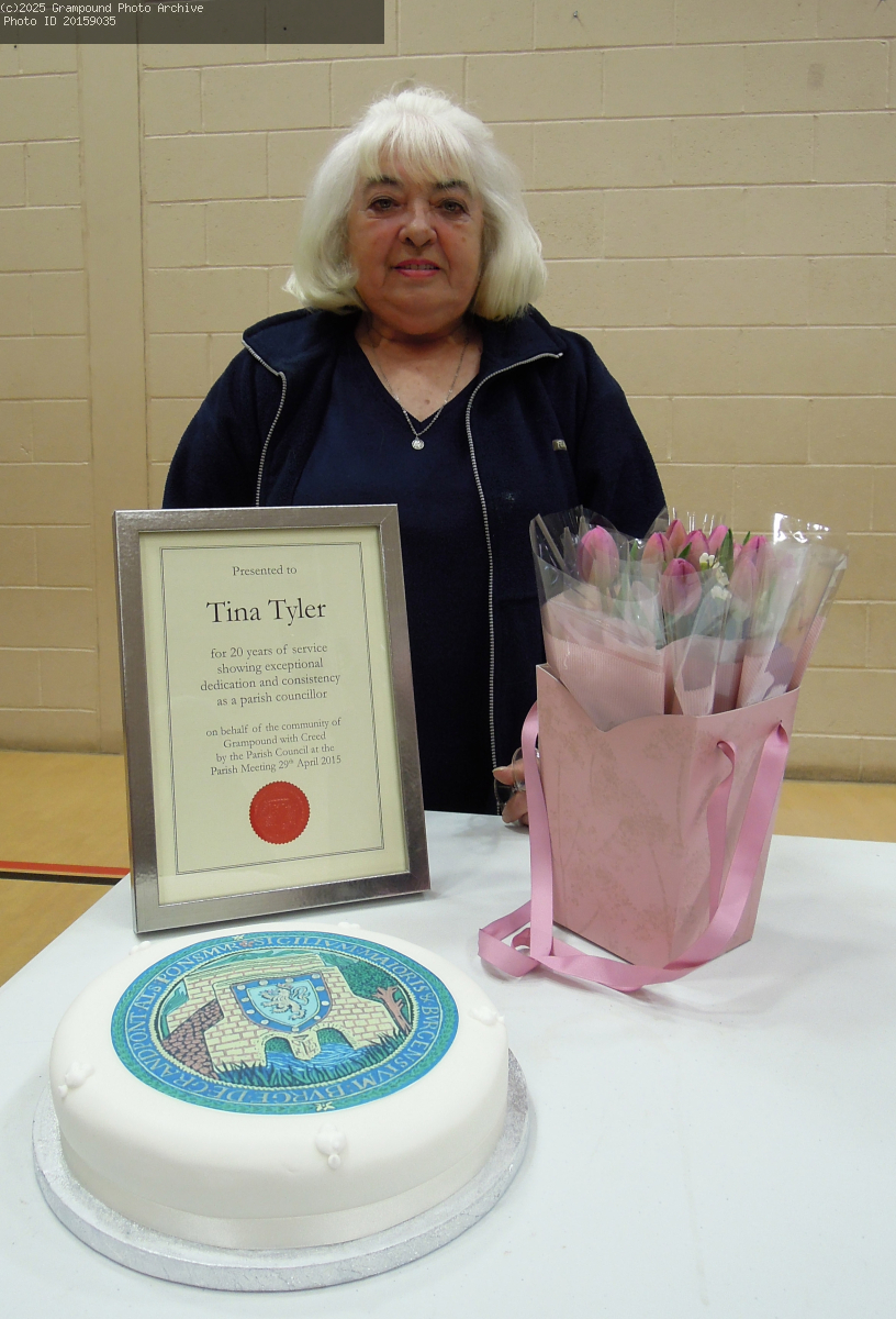 Tina Tyler received a Parish Award for 20 years on the Parish Council in 2015. Tina stands as the member for the outlying area of the Parish.