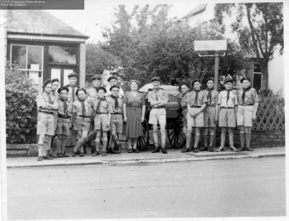 Scout troop outside the small barber's shop attached to Trevail. 1950's?
