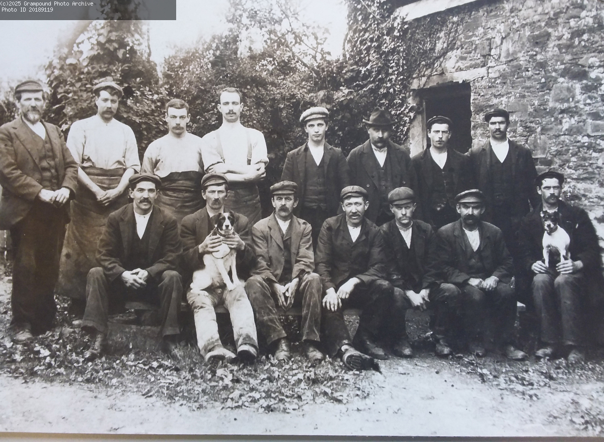 A group of tannery workers, probably from Croggon's Manor Tannery. The original of this photo is a glass plate negative. dated on reverse 1910. Named by Cyril Allen as Rutter (engine man), Clifford Bennett, Tom Edwards (currier), Tom Devonshire (currier), ? Broom (currier), W Bennett, Jack Knowles (sheds), George Tucker (yard), ? Lipton or Tregunna,