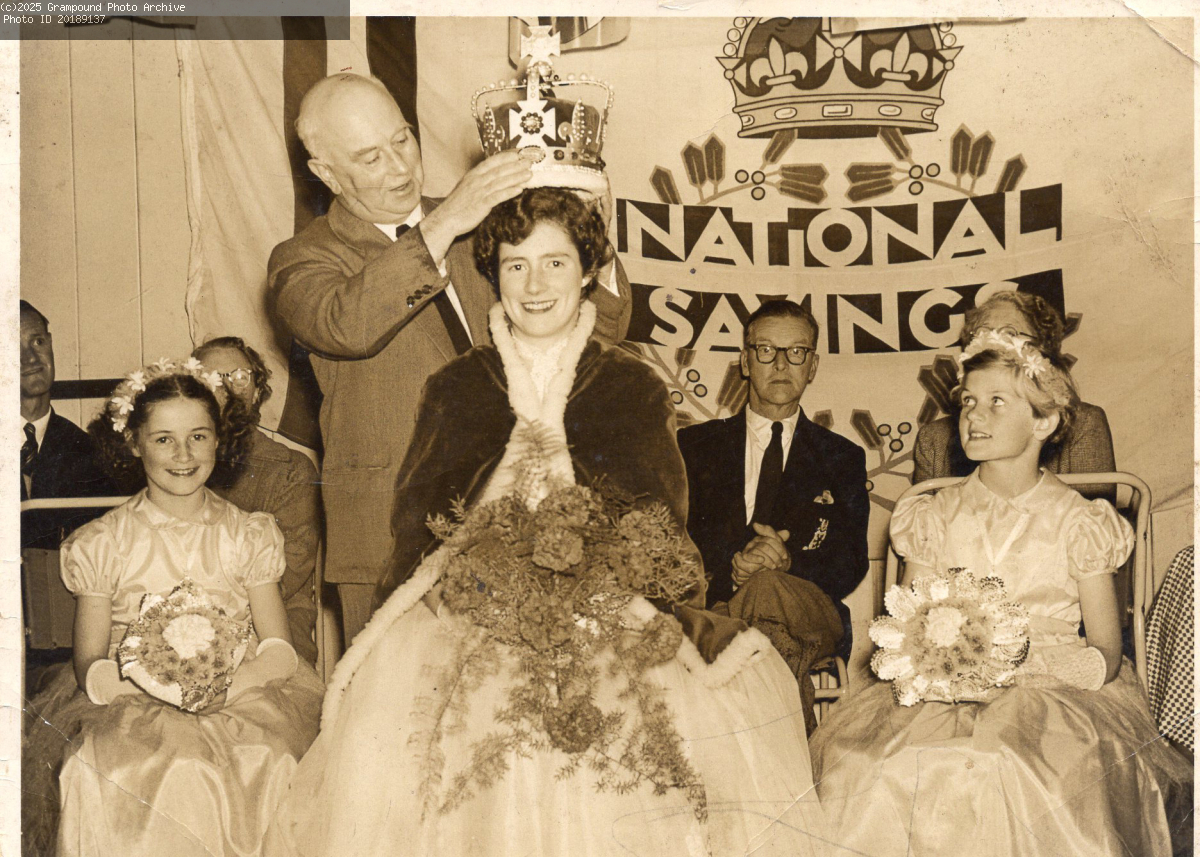 Dr Stewart crowning Joan Richards in 1956 (we think) with Penelope Spry on the left and Pat Bawden on the right.