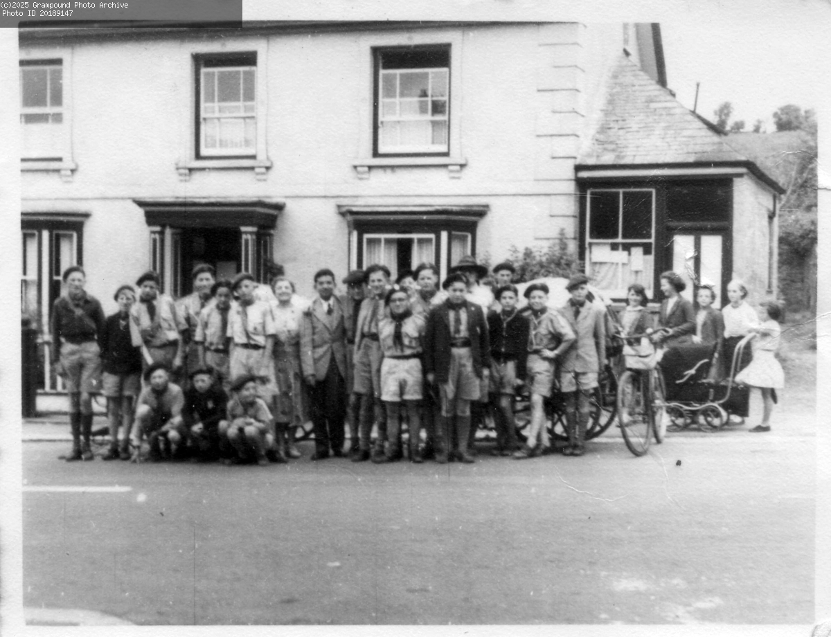 A scout troop outside Trevail, the barber's shop is the building on the right, attached to Trevail. 1950's