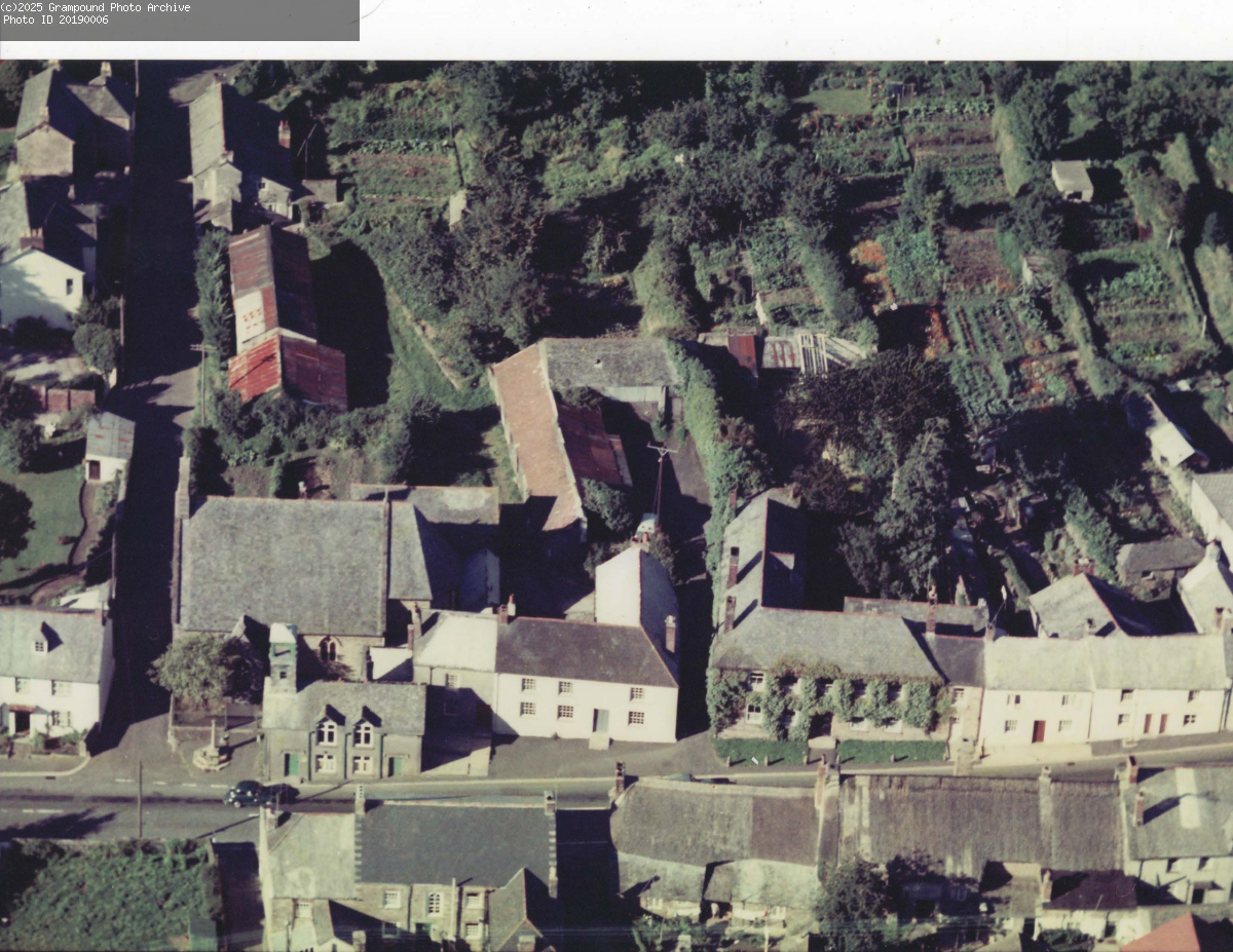 Aerial photograph of St Nun's church, the Town Hall, and the farm behind now Woodbine Villa. Bonython House and cottages to the east. Showing gardens behind the houses. Circa 1950's.