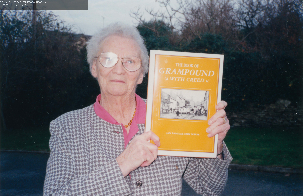 Amy Bane holding a copy of The Book of Grampound at the launch event in 1998.