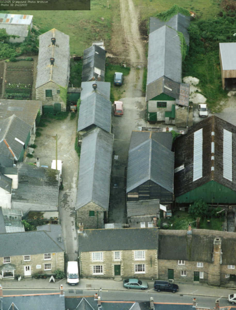 An aerial view of the main tannery sheds behind the Manor House in 1993. Way's bakery, with a white van parked behind it,is visible behind Radnor Antiques shop.